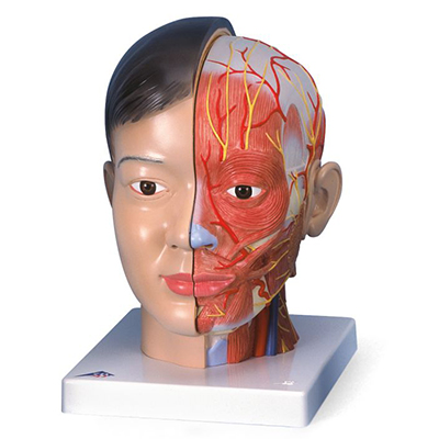 Ліва частина цієї моделі в натуральну величину з середнім сагітальним перерізом дає уявлення про м’язову структуру з нервами, кровоносні судини і кісткову будову, містить знімну половину мозку.